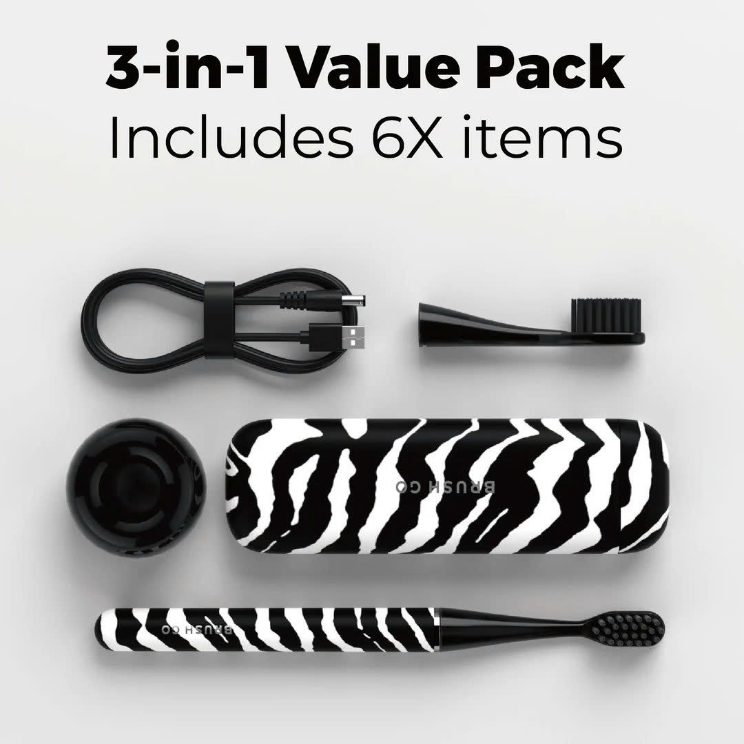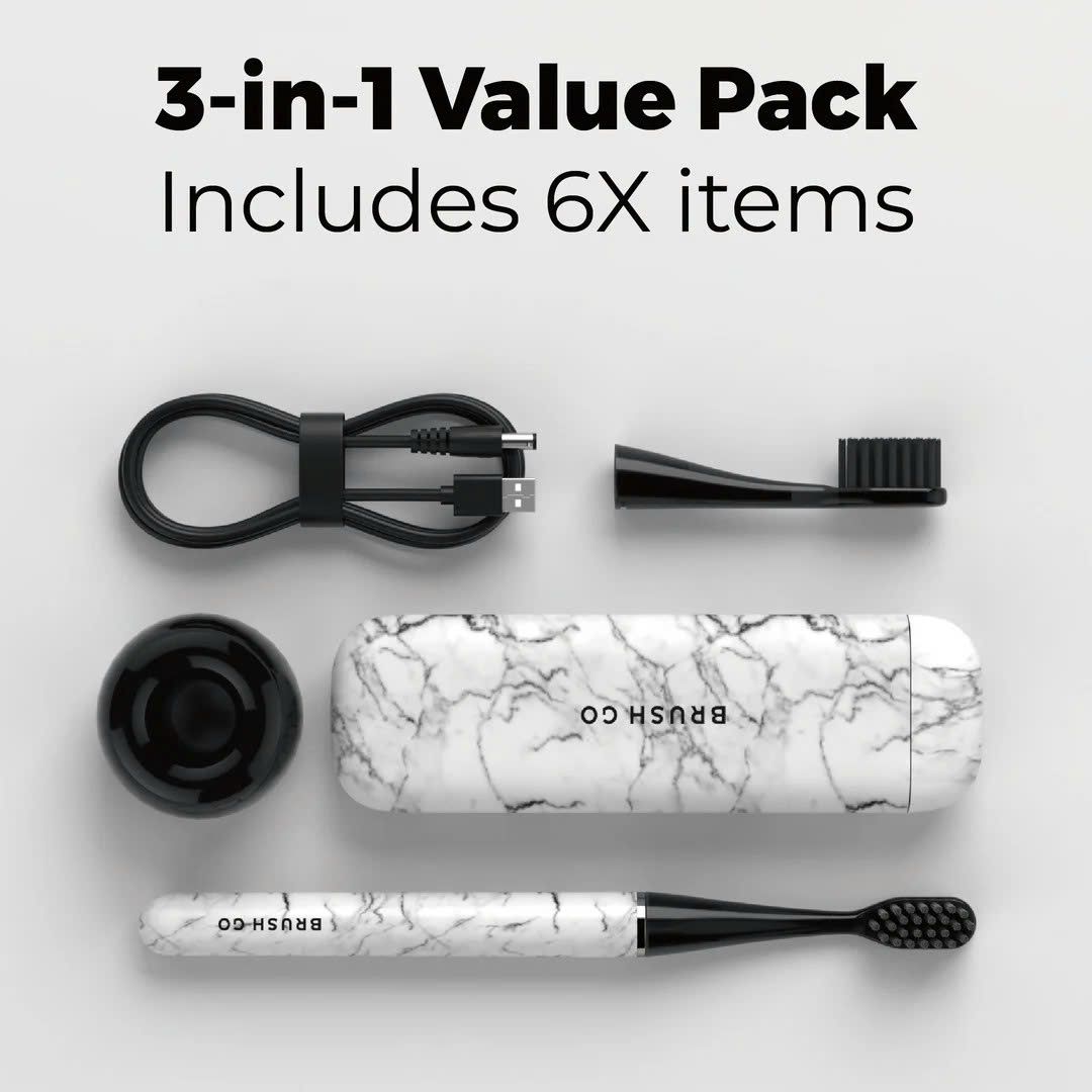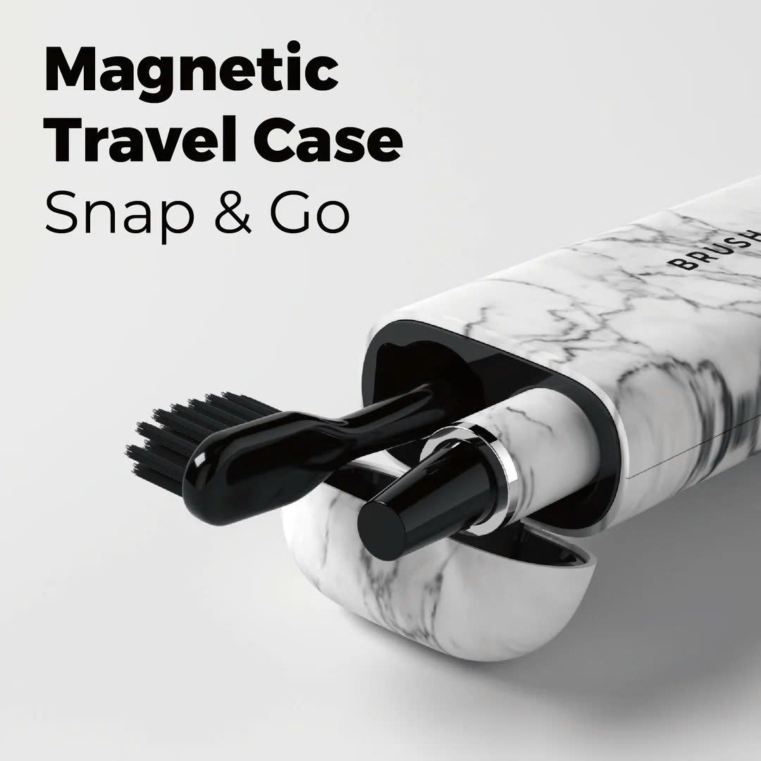 Combo 3-trong-1: Hộp đựng từ tính nhỏ gọn, chân đế sứ sang trọng, kèm 2 đầu FlexSoft mềm mại bảo vệ nướu.