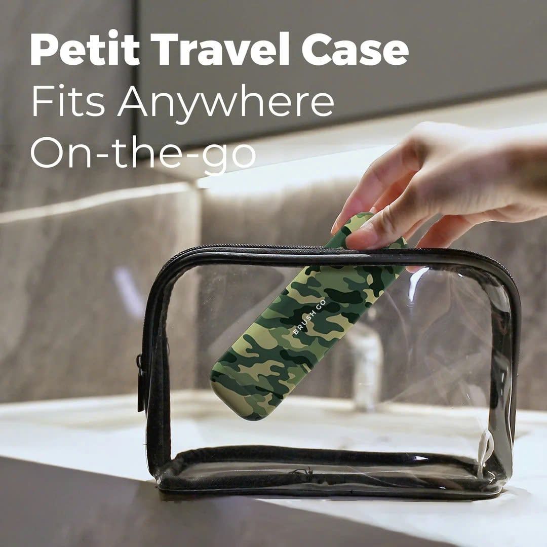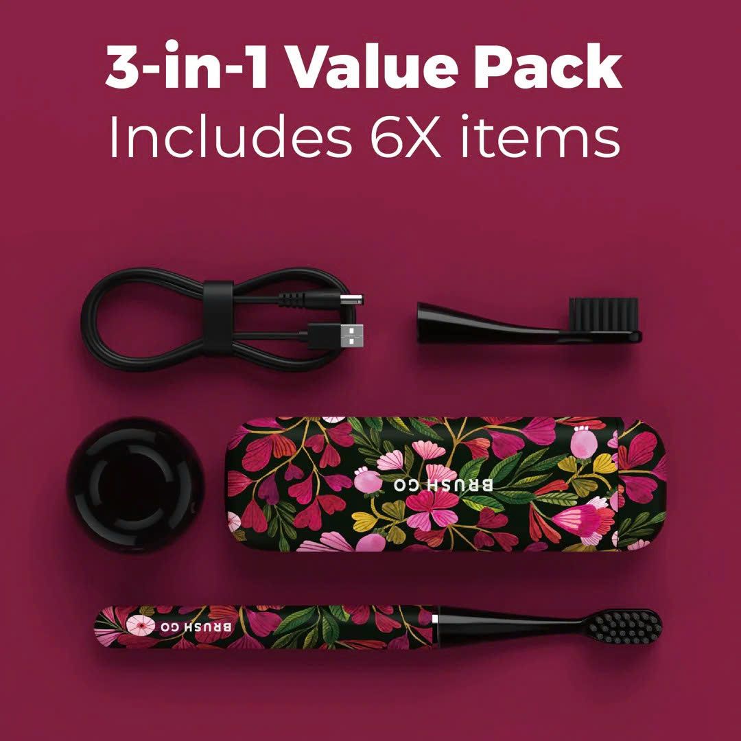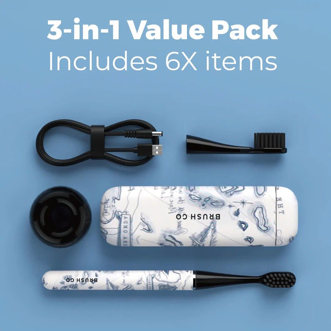 Combo 3-trong-1: Hộp đựng từ tính nhỏ gọn, chân đế sứ sang trọng, kèm 2 đầu FlexSoft mềm mại bảo vệ nướu.