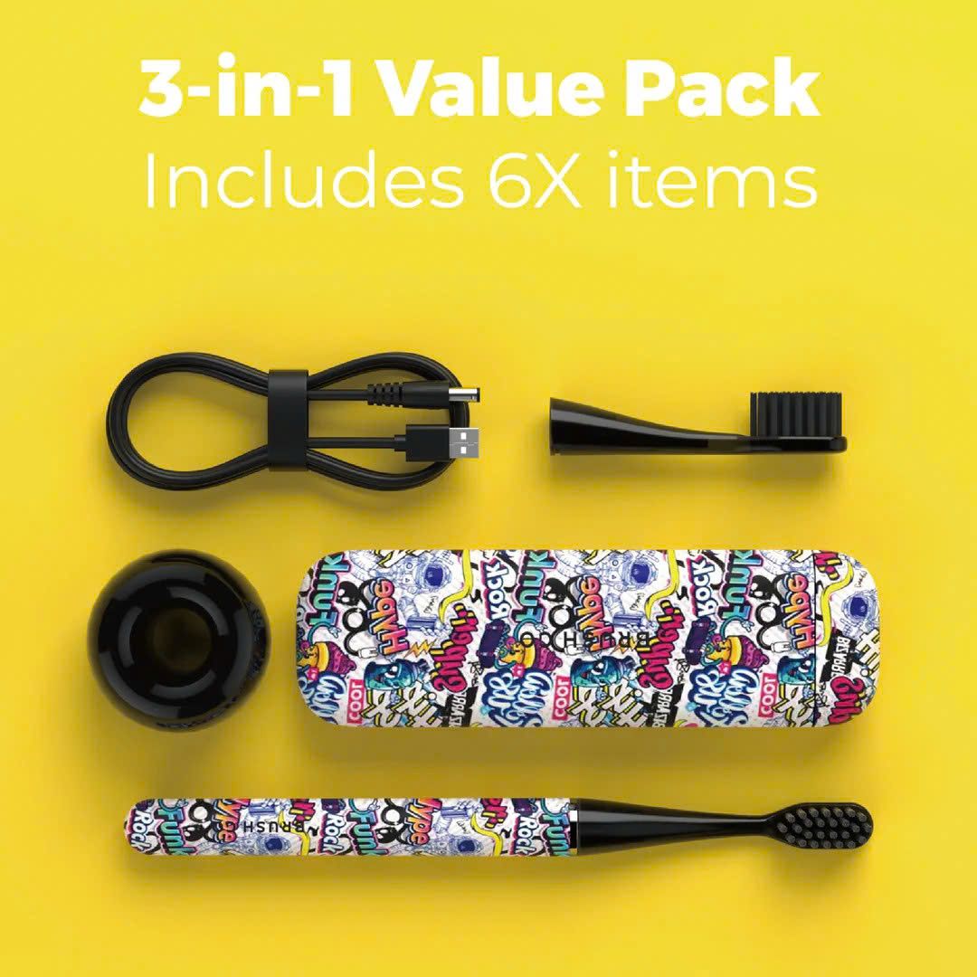 SlimPro i4 là bộ sản phẩm 3 trong 1 hoàn chỉnh với 6 món: 1 bàn chải đánh răng SlimPro i4, 1 hộp đựng du lịch từ tính, 1 đế giữ bằng gốm, 1 cáp USB và 2 đầu bàn chải FlexSoft. Một bộ sản phẩm hoàn chỉnh, sẵn sàng cho việc di chuyển và sử dụng hàng ngày.